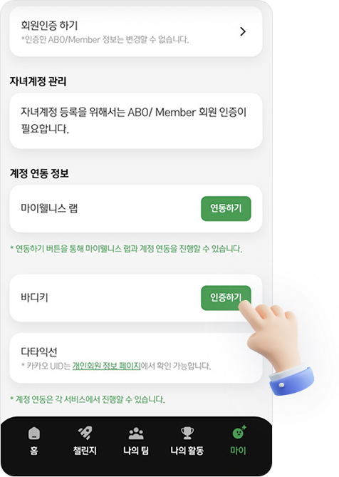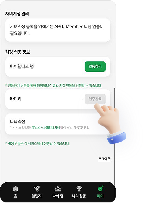 - 바디키 앱에 한번 연동한 계정은 변경 불가
